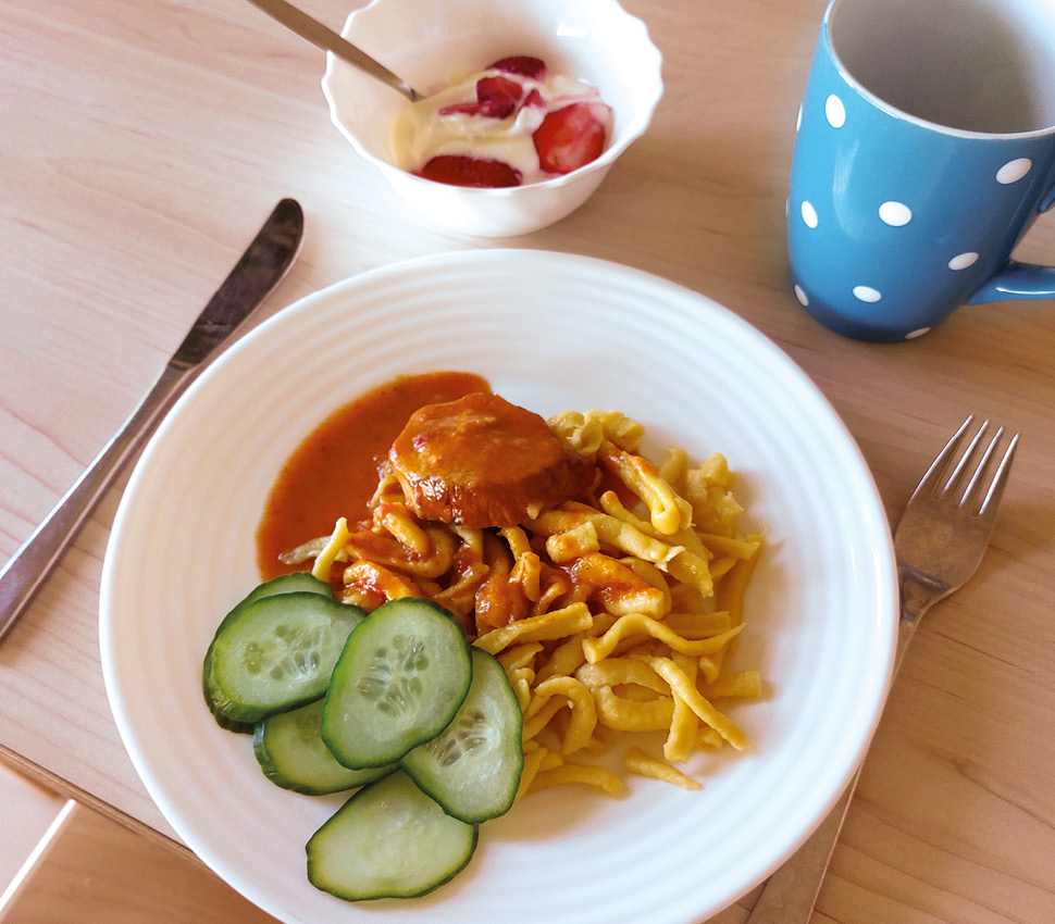 - Unser Mittagessen besteht immer aus mindestens zwei Komponenten (Hauptspeise und Dessert oder Suppe und Hauptgericht, wobei darauf geachtet wird, dass vor Süßspeisen eine sättigende Suppe angeboten wird).